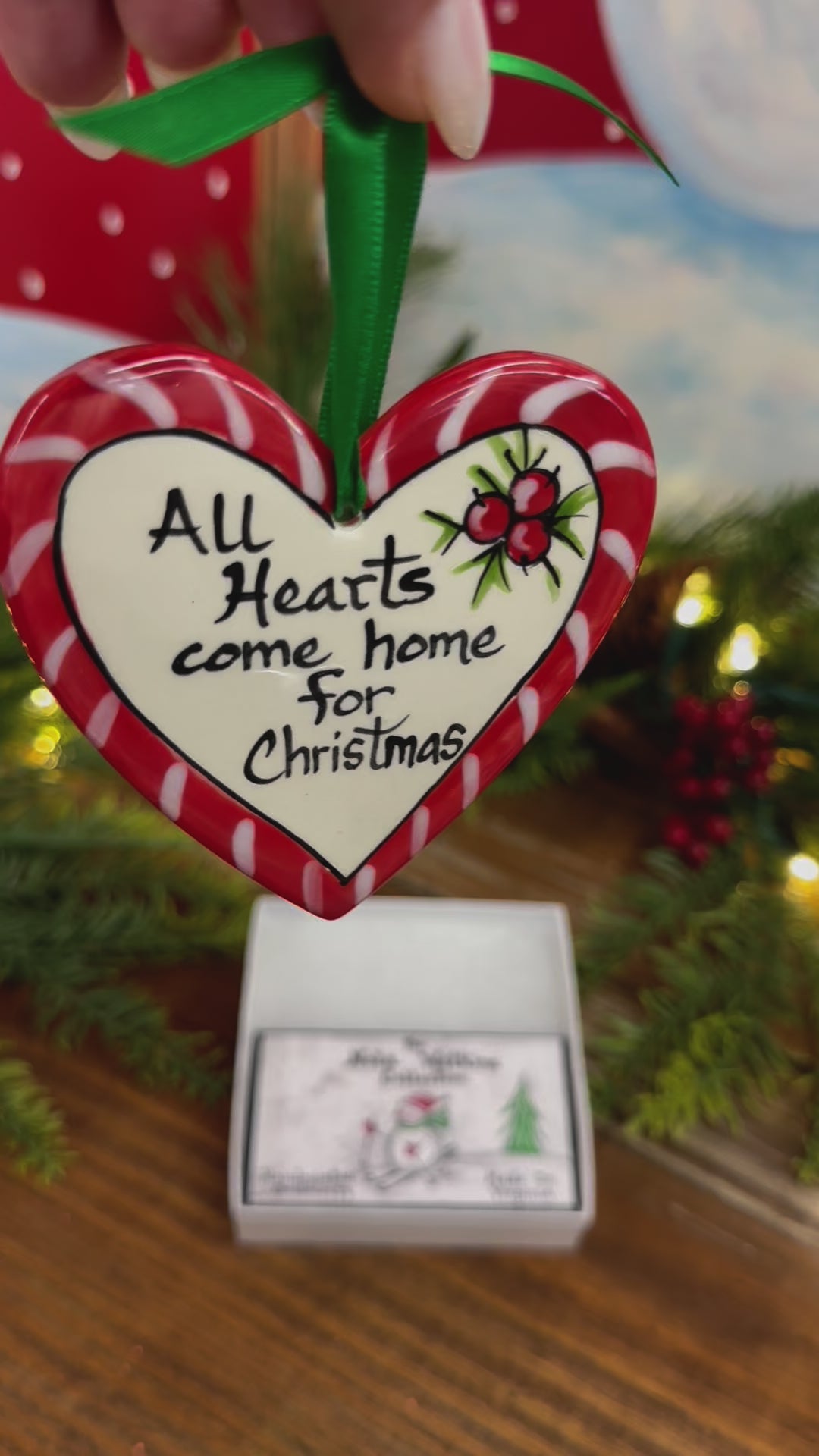 Our hand‑painted All Hearts Come Home for Christmas ornament features the beloved phrase on a beautifully crafted heart-shaped design, symbolizing the joy of being together at Christmastime. This touching ornament is perfect for family, friends, or anyone who treasures holiday traditions.