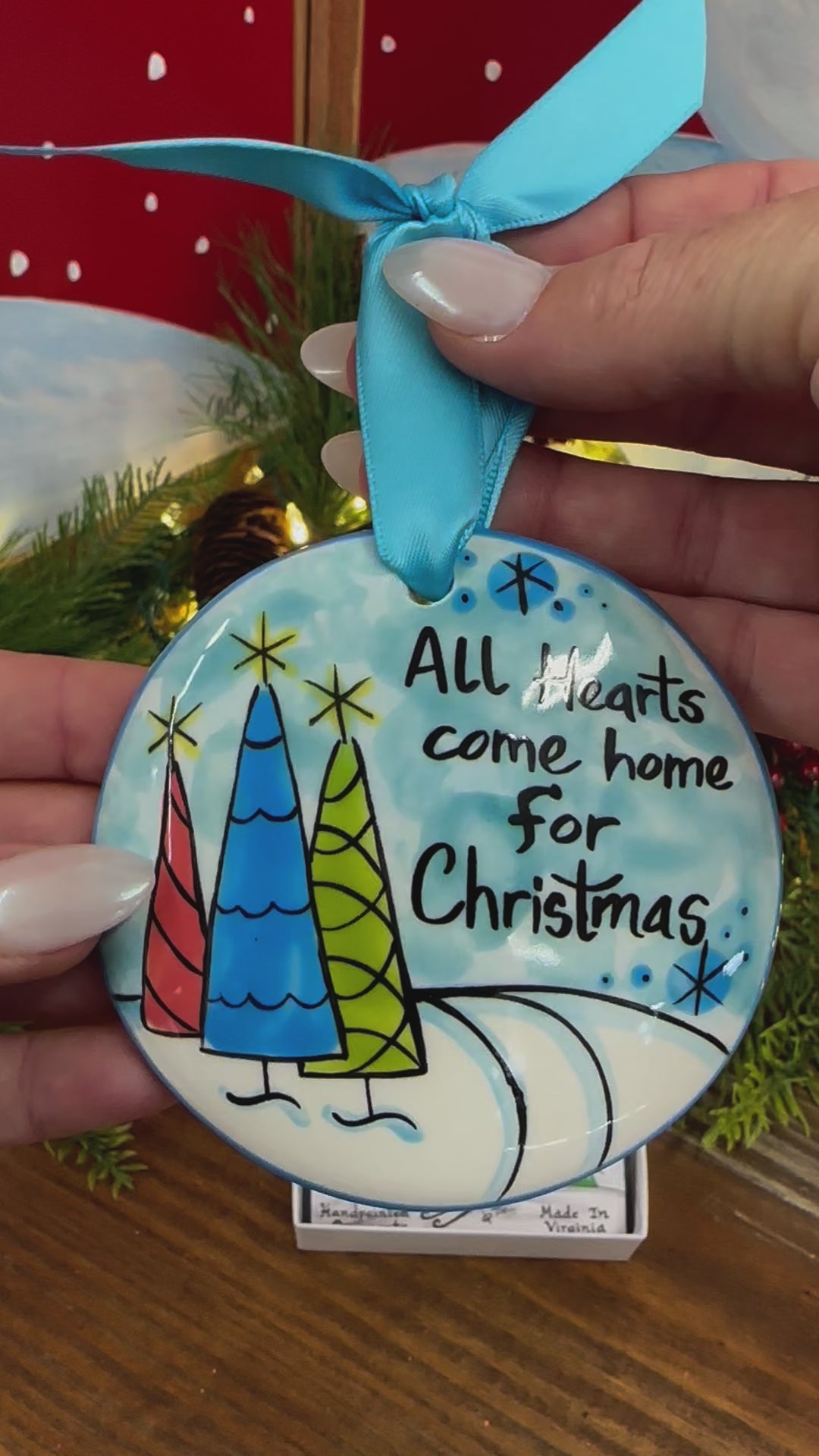 Our hand‑painted All Hearts Come Home for Christmas ornament features a colorful, wintry scene paired with the beloved holiday sentiment. This cheerful and nostalgic design reminds us that the true magic of Christmas is being together.