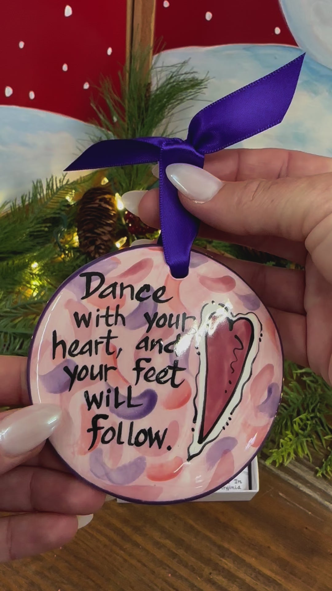 Our hand‑painted Dance Heart – Purple ornament features a graceful purple heart with delicate dance‑themed details and the heartfelt phrase: Dance with your heart and your feet will follow. Perfect for dancers of all ages, this ornament is a beautiful reminder of passion and dedication.