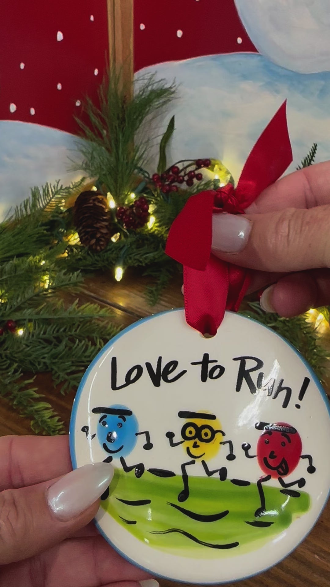 Our hand‑painted Love to Run ornament features three fun, colorful runners in motion, perfect for anyone who finds happiness on the trail or track. This spirited design adds a playful, athletic touch to your holiday décor — and reminds us all to keep moving forward.