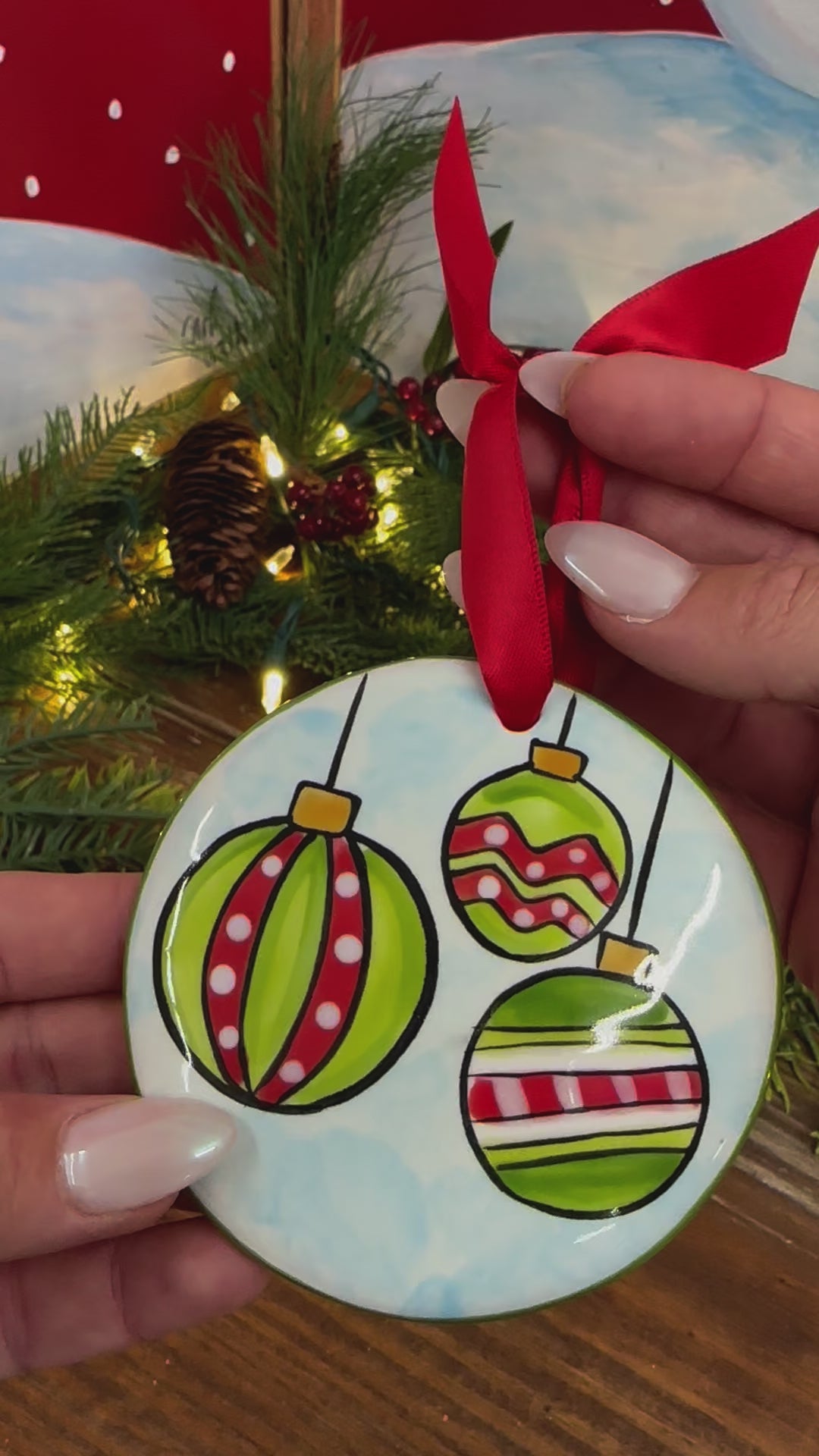 Our hand‑painted Retro Ornaments Trio – Red & Green ornament features three whimsical retro-style ornaments in traditional red and green hues, evoking the timeless charm of mid-century Christmas décor. This cheerful design is perfect for those who love a nostalgic holiday look.