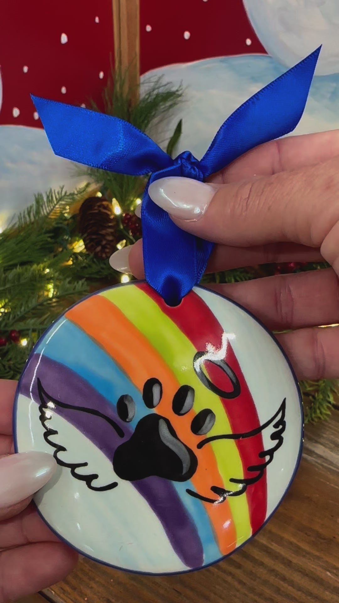 Our hand‑painted Rainbow Bridge with Paw ornament features a soft rainbow arching above a tender paw print, symbolizing the journey our furry friends take when they cross the Rainbow Bridge. This touching design brings love and remembrance to your holiday tree.