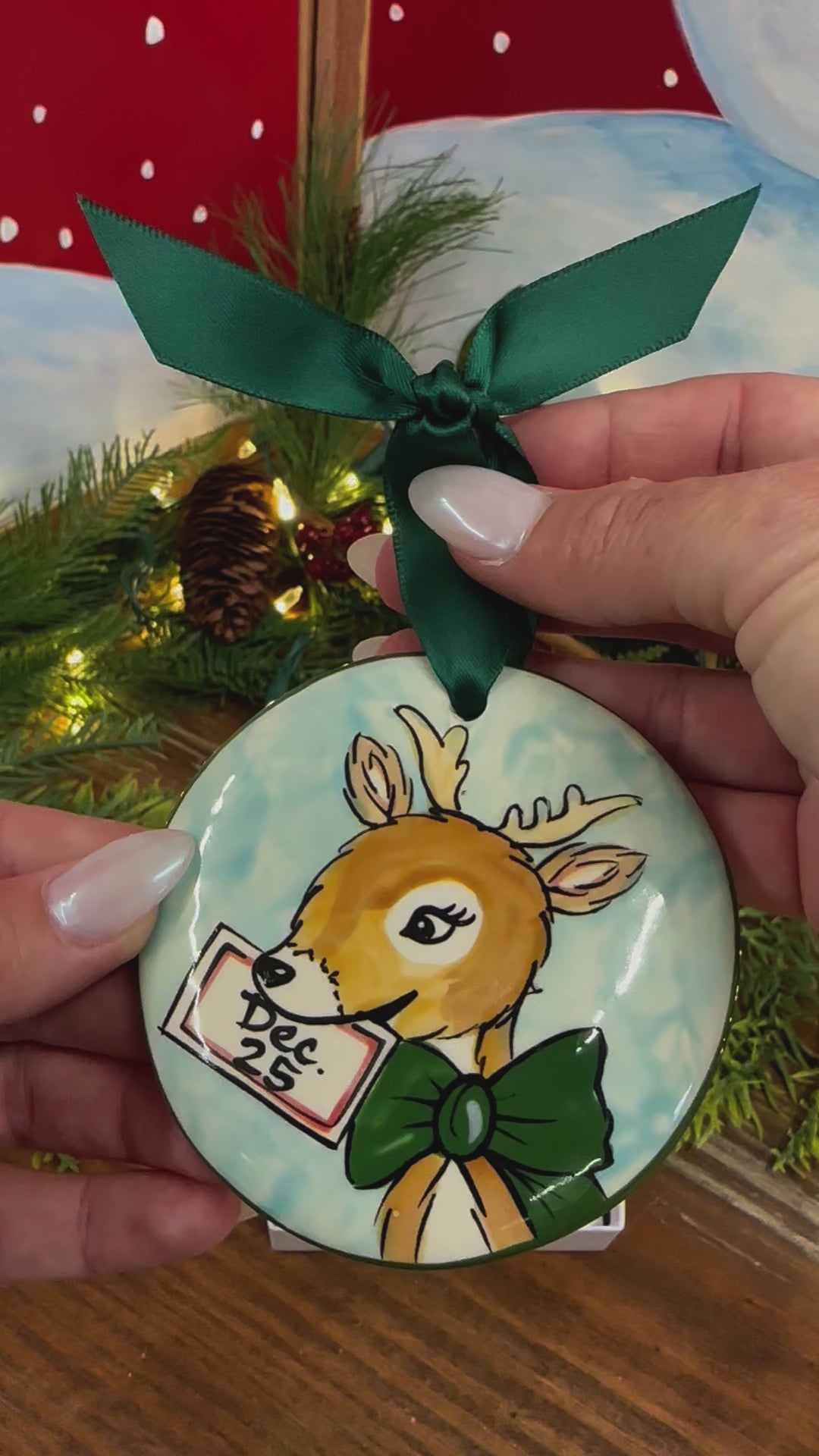 Our hand‑painted Reindeer – Dec 25 Green ornament features an adorable reindeer accented with the date Dec 25 and highlighted in a cheerful green holiday color scheme. This playful yet timeless design brings warmth and whimsy to your tree.