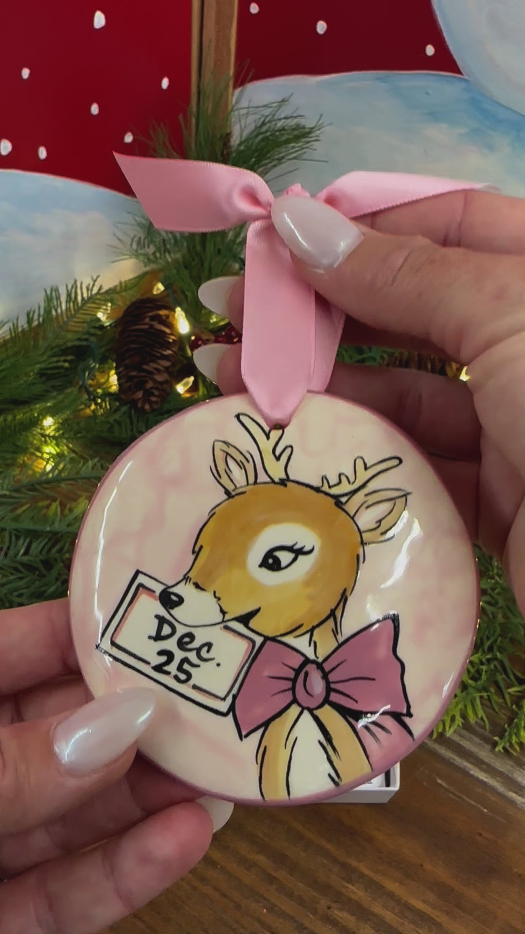 Our hand‑painted Reindeer – Dec 25 Pink ornament features an adorable reindeer design accented with the date Dec 25and charming pink holiday details. This whimsical ornament is perfect for adding a unique, modern twist to your Christmas décor.