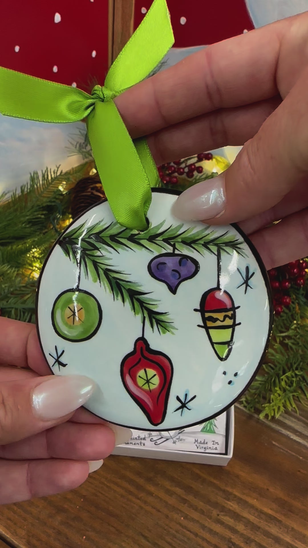 Our hand‑painted Retro Ornaments ornament features a playful arrangement of vintage‑inspired baubles in fun shapes and colors, perfect for evoking the charm of mid‑century holiday décor. This cheerful design is ideal for those who love the timeless magic of a retro Christmas.