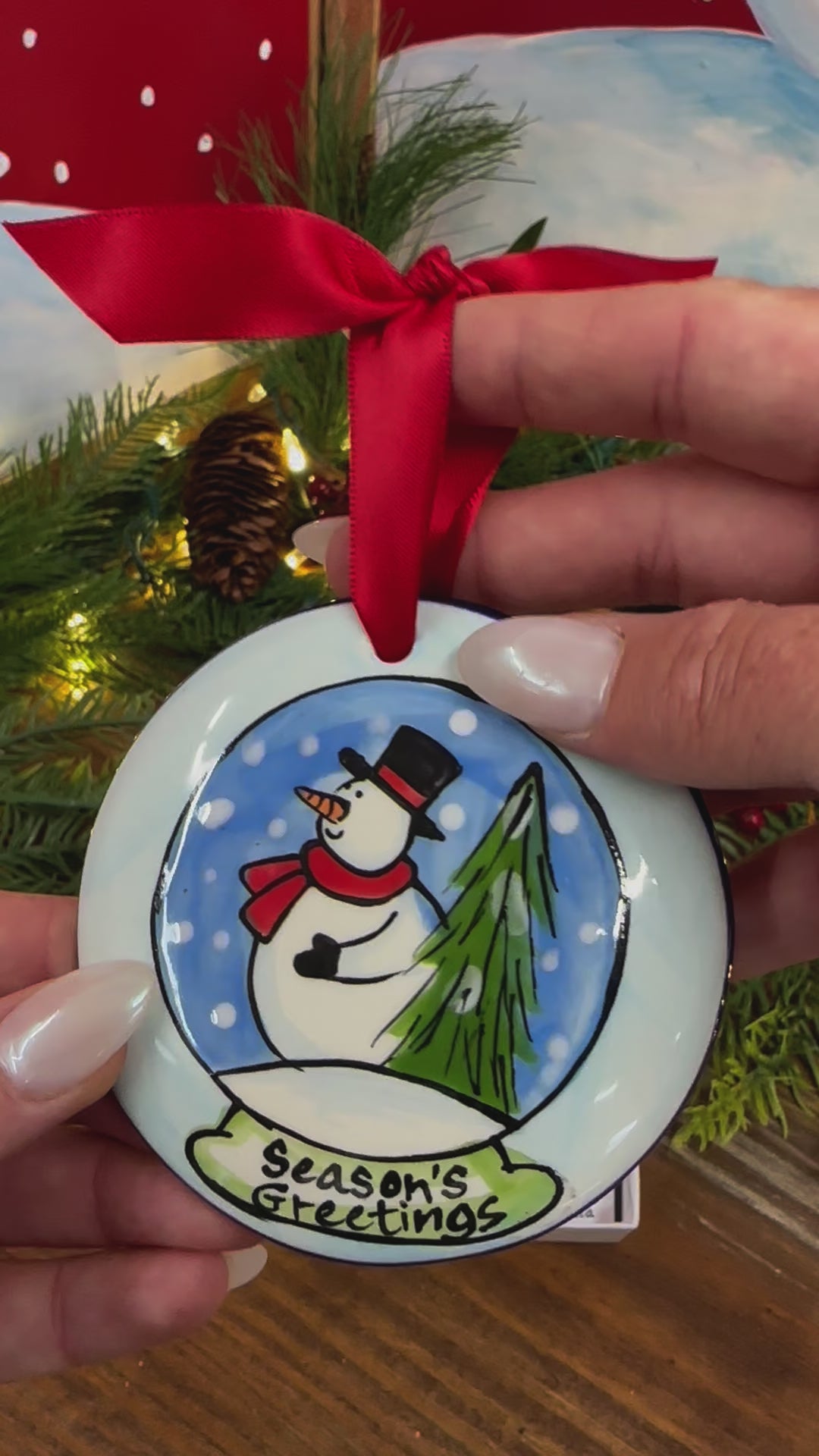 Our hand‑painted Snowman Snow Globe – Season’s Greetings ornament features an adorable snowman inside a whimsical snow globe, complete with the classic phrase Season’s Greetings. This charming design captures the magic and joy of the holiday season, perfect for any tree.