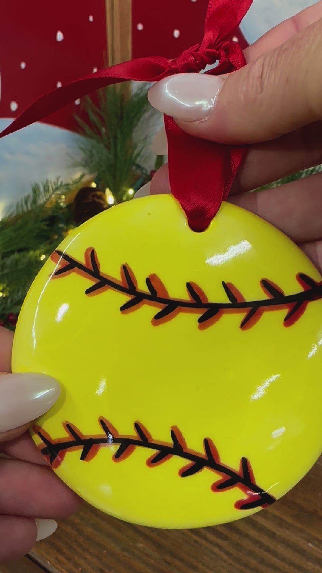 Our hand‑painted Softball ornament features a classic yellow softball and bat design, perfect for players, coaches, and fans of the game. This vibrant ornament brings team spirit and love of the sport to your Christmas tree.