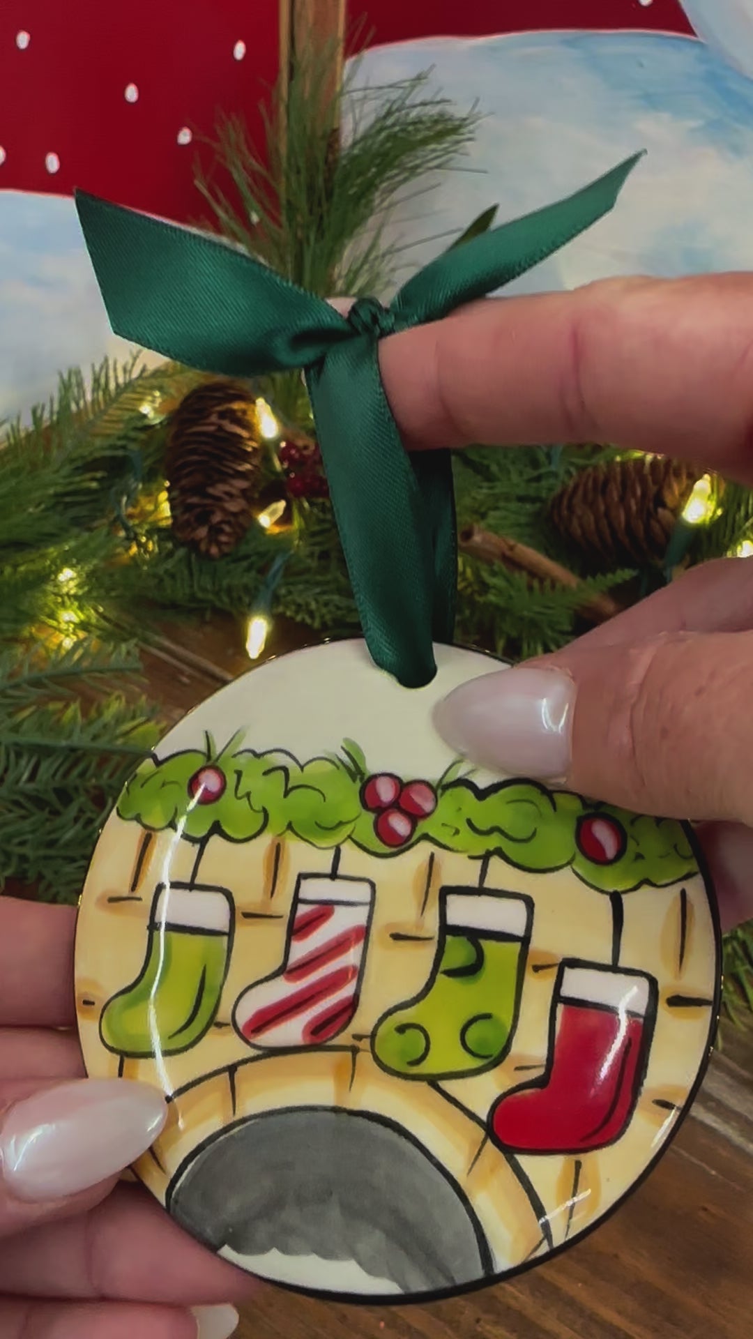 Our hand‑painted Stockings by the Fireplace ornament features four festive stockings hanging from a beautifully detailed fireplace, ready for Santa’s visit. This charming design brings the warmth of home and family traditions to your holiday tree.