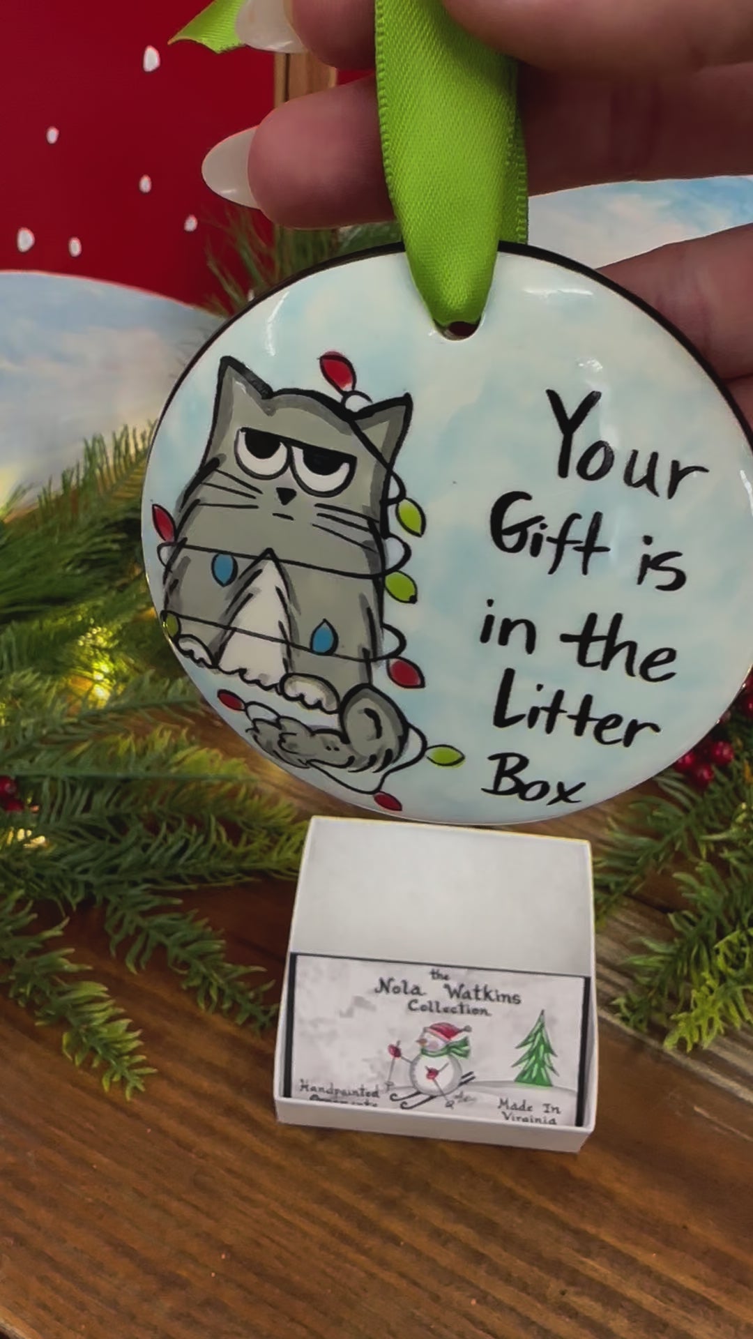 Our hand‑painted Your Gift is in the Litter Box ornament features an adorable cat with a cheeky expression, paired with the hilarious sentiment that every cat lover can relate to. This fun and whimsical design is perfect for cat owners who know their pets are full of surprises.